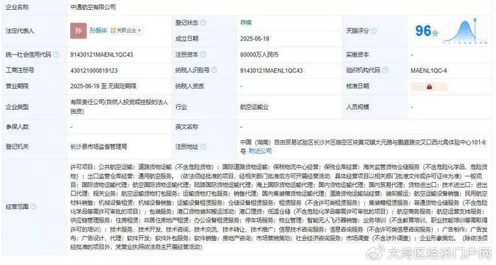 天眼查最新信息顯示,中通航空有限公司于6月19日在長沙自貿臨空區正式注冊成立,注冊資本6億人民幣,由中通快遞股份有限公司全資持股。該公司法定代表人為孫振華,經營范圍覆蓋公共航空運輸、智能無人飛行器銷售等核心領域。據《長沙晚報》報道,這是湖南省首家本土貨運航空公司,標志著中通正式加入順豐、京東的航空貨運戰局。